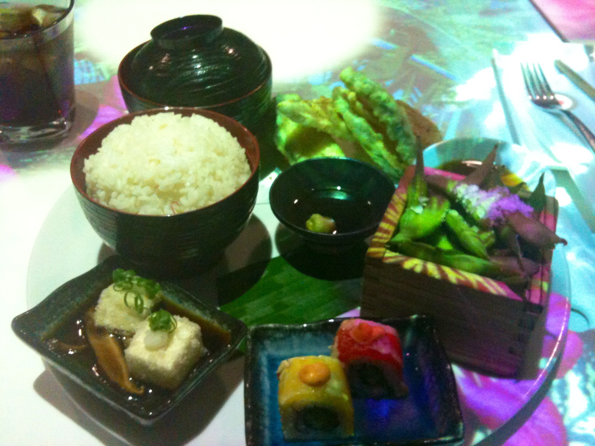 I managed to order myself a drink and after looking through the menu I went for the set vegetarian bento box which was around £8.50. This included mixed pickled vegetables, tofu, miso soup, edamame beans, rice and vegetarian sashimi.