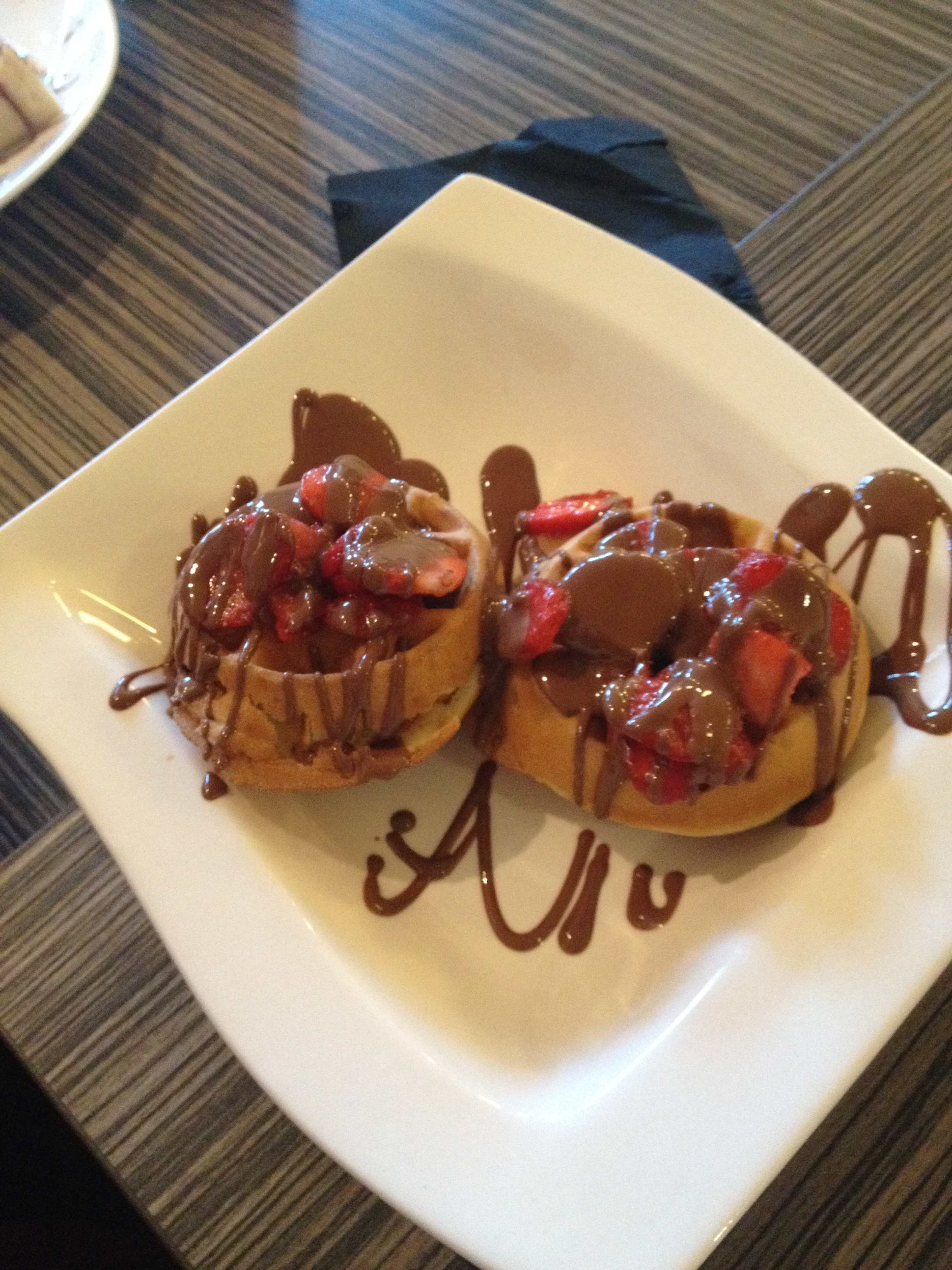 Waffles with 2 toppings (£3.50) of strawberries and again coated with warm milk chocolate: