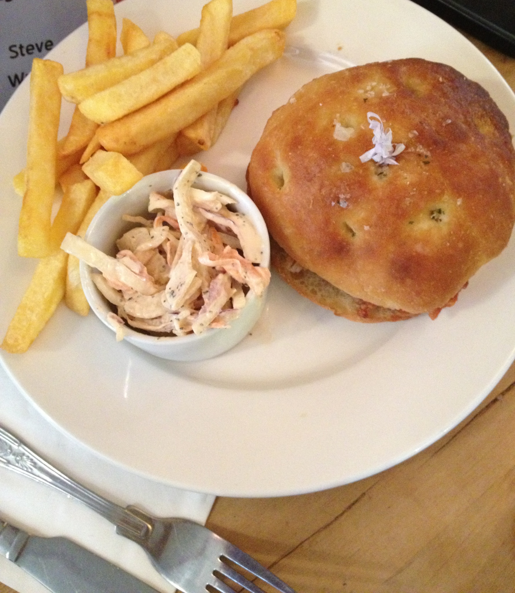A Pulled Pork Sandwich served on home-made Foccacia Bread (£6.95) with a home-made BBQ sauce served with Coleslaw and for an extra price you can add chips: