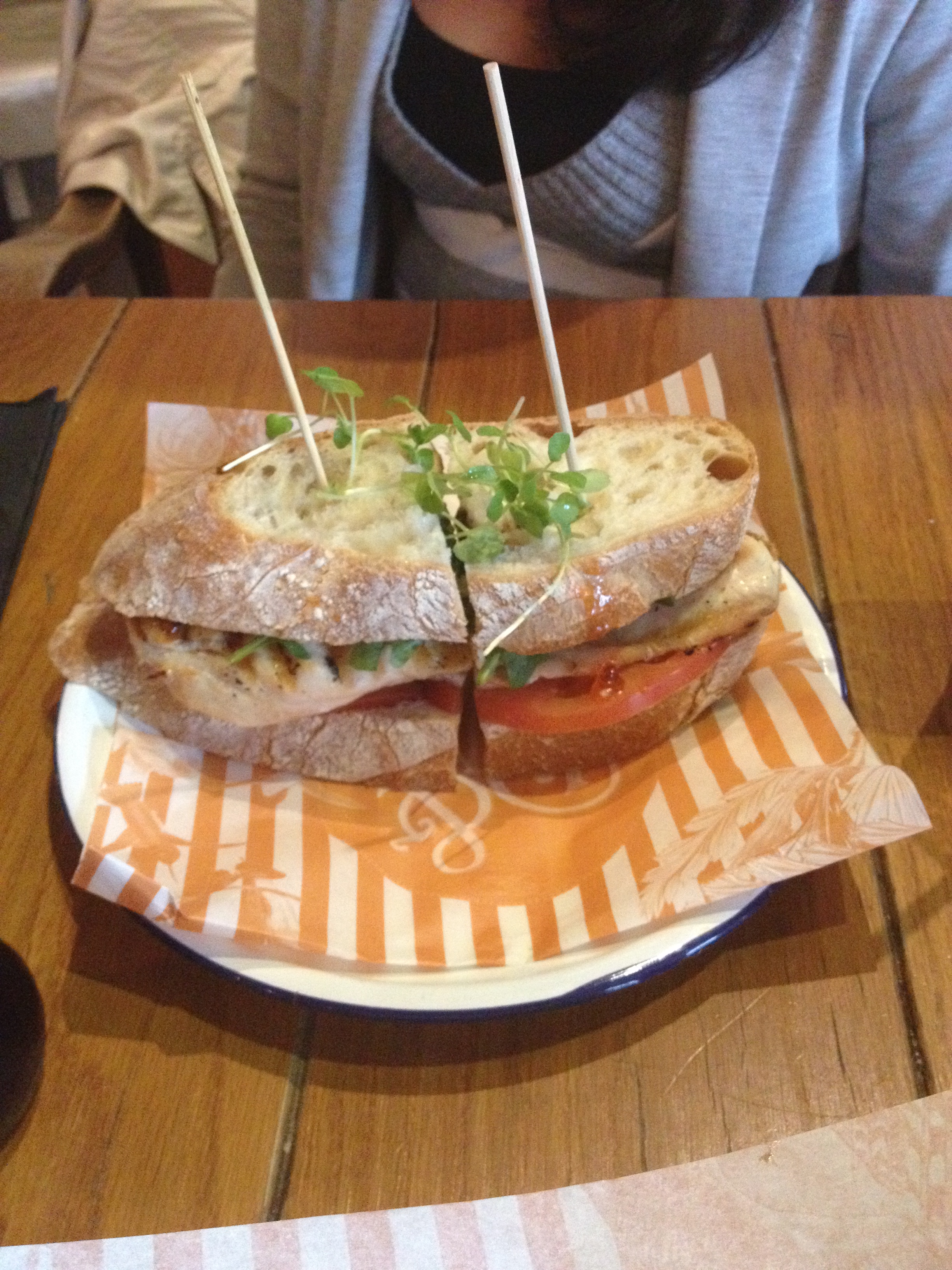A Chargrilled Chicken Club Sandwich served with mayo, tomato, bacon salad leaves and chilli jam (£7.50).