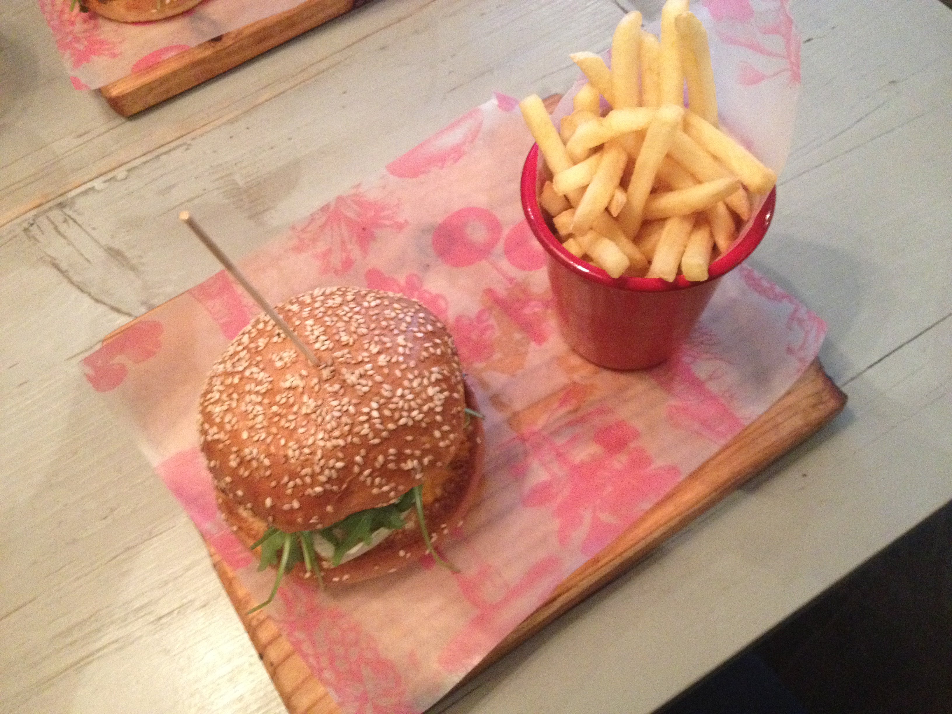 A good thing about Bills is that it serves, breakfast (till noon), lunch and dinner which a great selection to choose from including a full English breakfast, burgers, and mains like risotto. We both decided on a glass of house rose (£3.95) and selected the ‘Halloumi and Hummus Burger’ (£8.95) with baby gem lettuce, roasted peppers, sweet chilli and yoghurt in a grilled sesame seed bun, served with skinny fries.