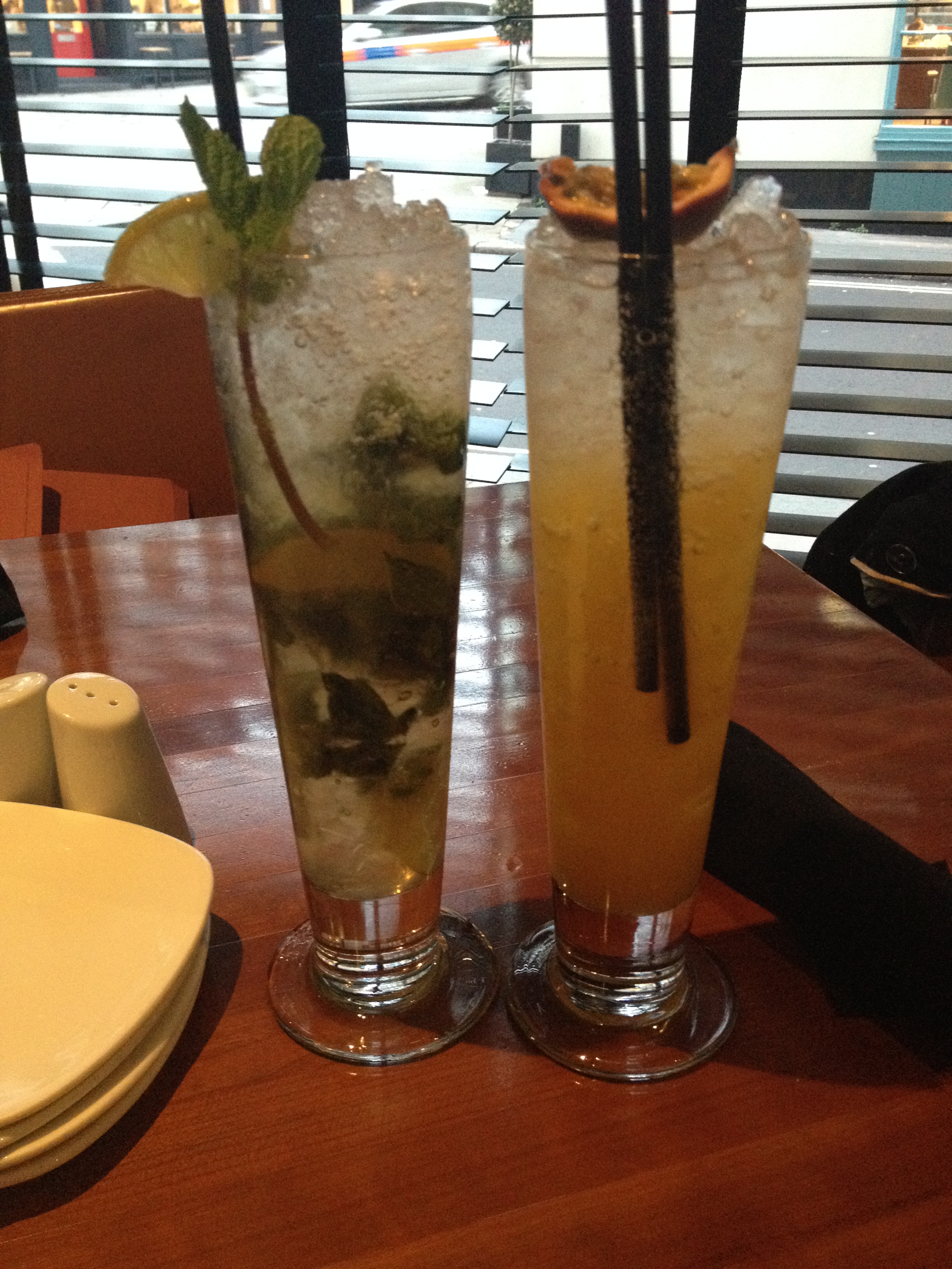 The cocktail menu was good, and the service by the waitress was great, my other half loves making them part of the dining experience so always asks for their suggestions, its either that or he is chatting them up…ha! Either way she gave her opinions and being an auspicious day we opted for the following mocktails, a Virgin Apple Mojito with fresh mint, lime, apple juice and soda water. And I opted for the Mango Passion Cooler, which included fresh passion fruit and mango with lime juice, agave syrup topped with lemonade, both priced at £4.95.