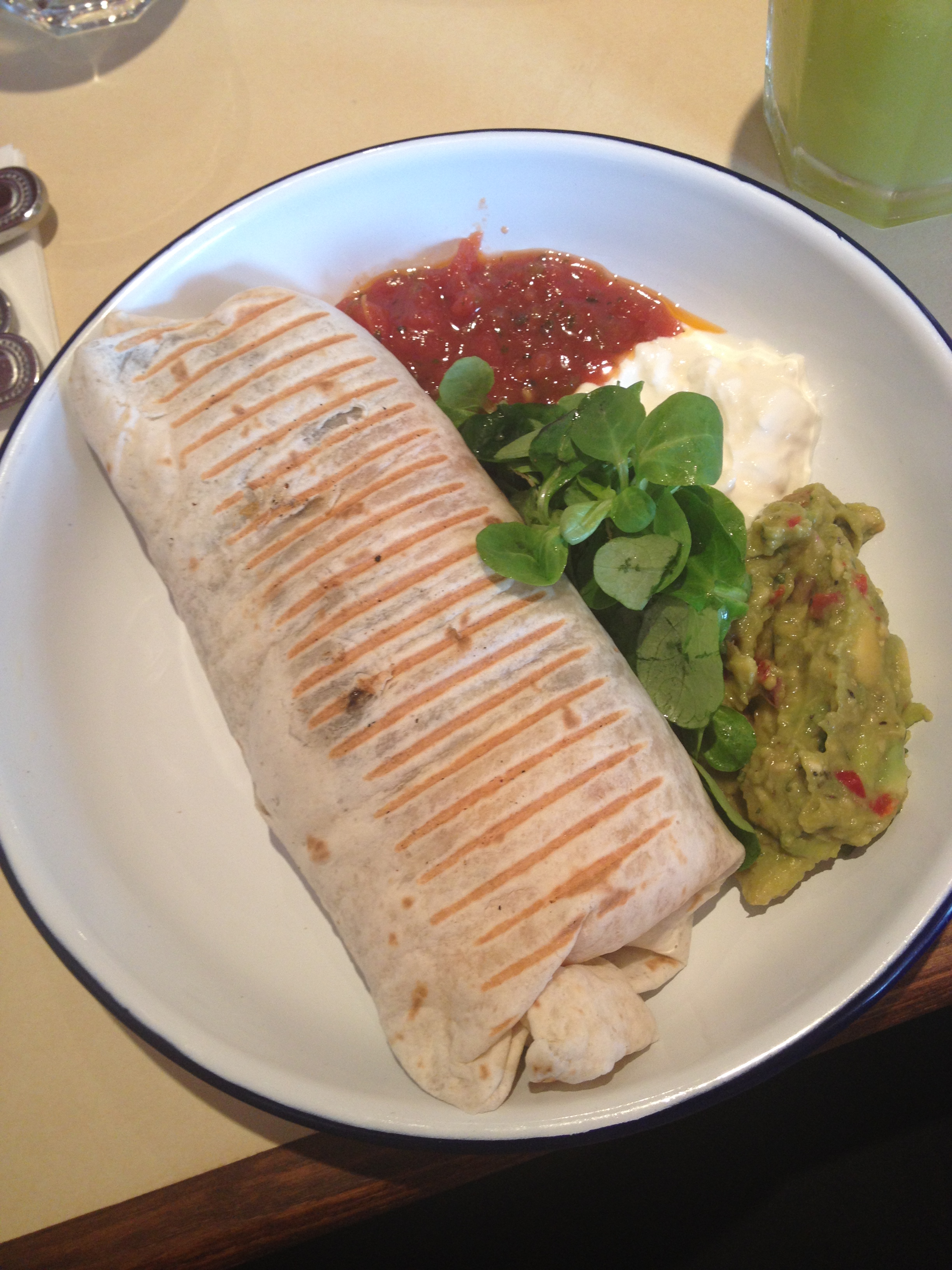 We then went onto to order our lunch this included: ‘When Haloumi Met Salad Wrap’ which was a grilled haloumi, sunblush tomatoes, houmous, spinach and balsamic in a tortilla wrap (£8.50). ‘The All American’ which included pancakes, sausages, eggs, fried potatoes and streaky bacon with maple syrup (£10.50). ‘Bacon and Banana French Toast’ (£7.90) and I selected the ‘Veggie Breakfast Burrito’ which included, scrambled egg, mushrooms, roasted peppers, guacamole, cheddar with a spicy pepper sauce (£8.50).