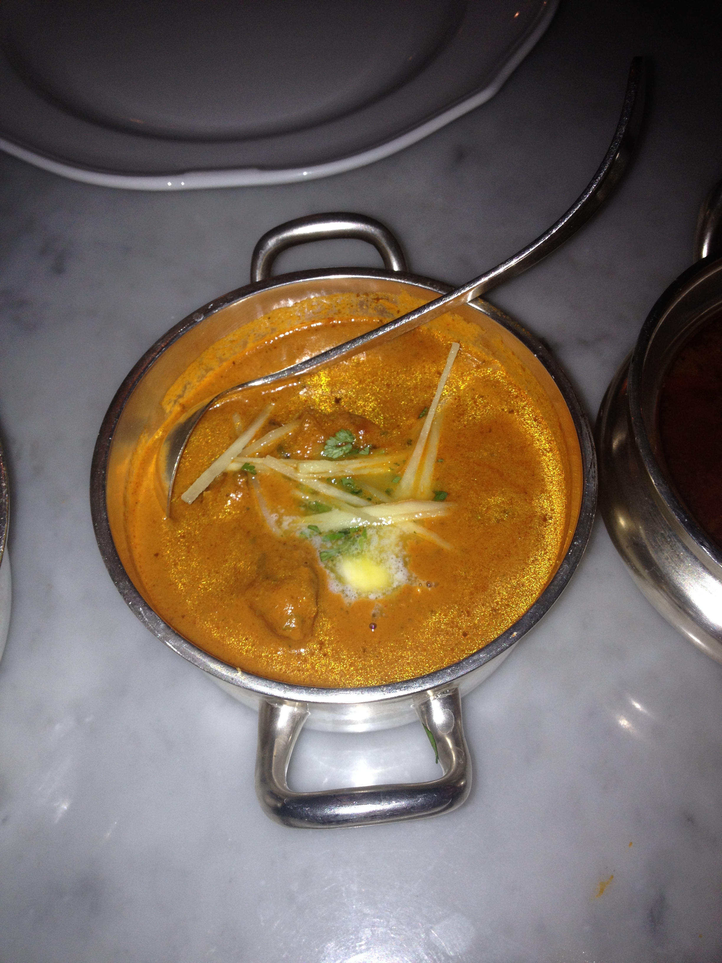 The next part of the menu is: ‘Game and Chops’ I wasn’t so keen on anything on this part of the menu but my fiance and brother in law were tempted to try the ‘Achari Roe Deer Chop’ but then decided to get a few curry dishes instead, these included ‘Suckling Pig Vindaloo’ (£20.00) and ‘Chicken Butter Masala (£15.00). I didn’t try the vindaloo, but the chicken however was edible, slightly sweet in flavour for my liking. We accompanied these dishes with a selection of bread (£6.00), basmati rice and pomegranate and mint raita (£4.00).