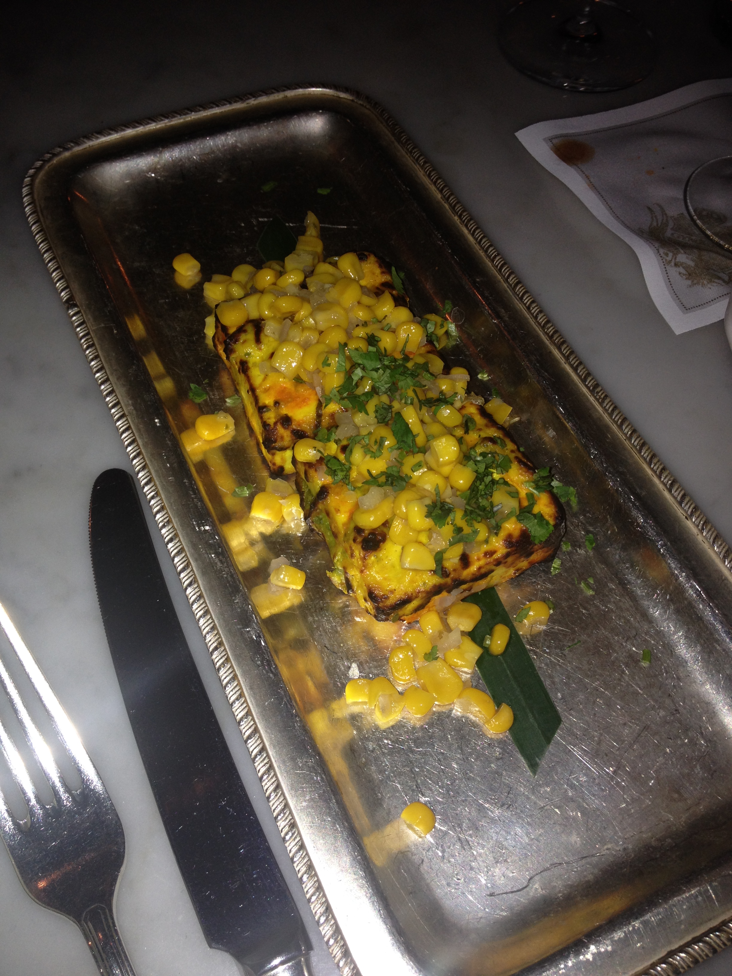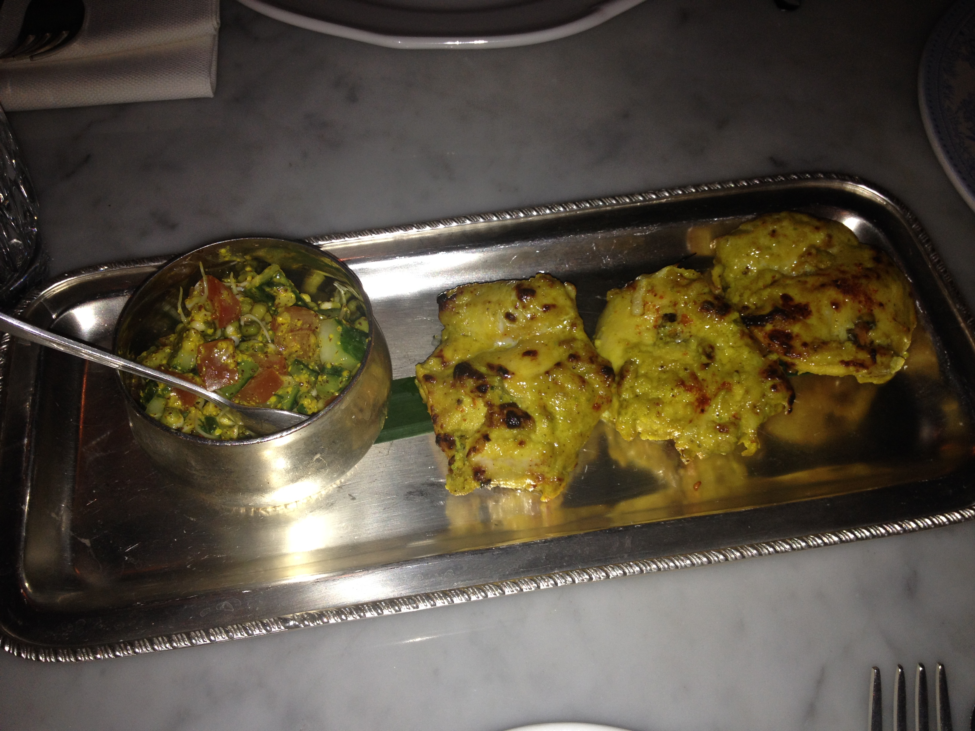 The concept is based on the colonial gymkhana clubs serving contemporary Indian cuisine, catering for both non-veg and vegetarians. On entering the restaurant which is divided over two floors, you can see the references of the British Raj India, with dark wood ceilings, fans hanging from the ceiling; black and white pictures hung on the walls, wooden booths and marble tables, with a bar at the back of the room, where my fiance and I waited before being seated on our table with some lovely champagne.