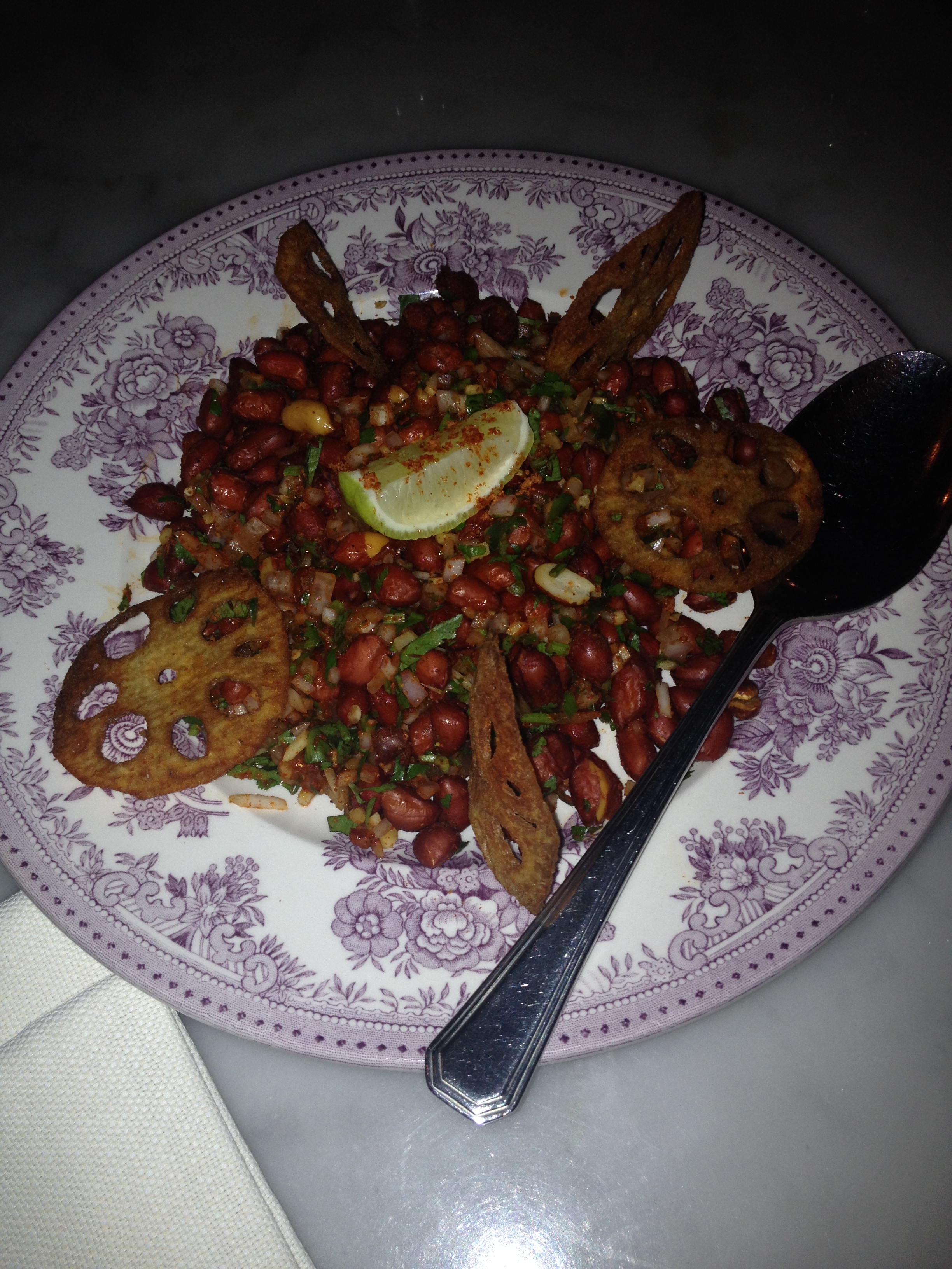 From the ‘Gymkhana Bar’ and ‘Nashta’ section of the menu we chose: ‘Gol Guppas’,(£5.00), ‘Dosa with Chettinad Duck’ and served with Coconut Chutney (£10.00). The other vegetarian dishes included; ‘Masala Peanut & Lotus Root Chat’ (£3.50), ‘Punjabi Vegetable Samosa’ with Imli saunth (£8.00), ‘Potato Chat’ served with chickpeas, tamarind, and sev (£7.00).