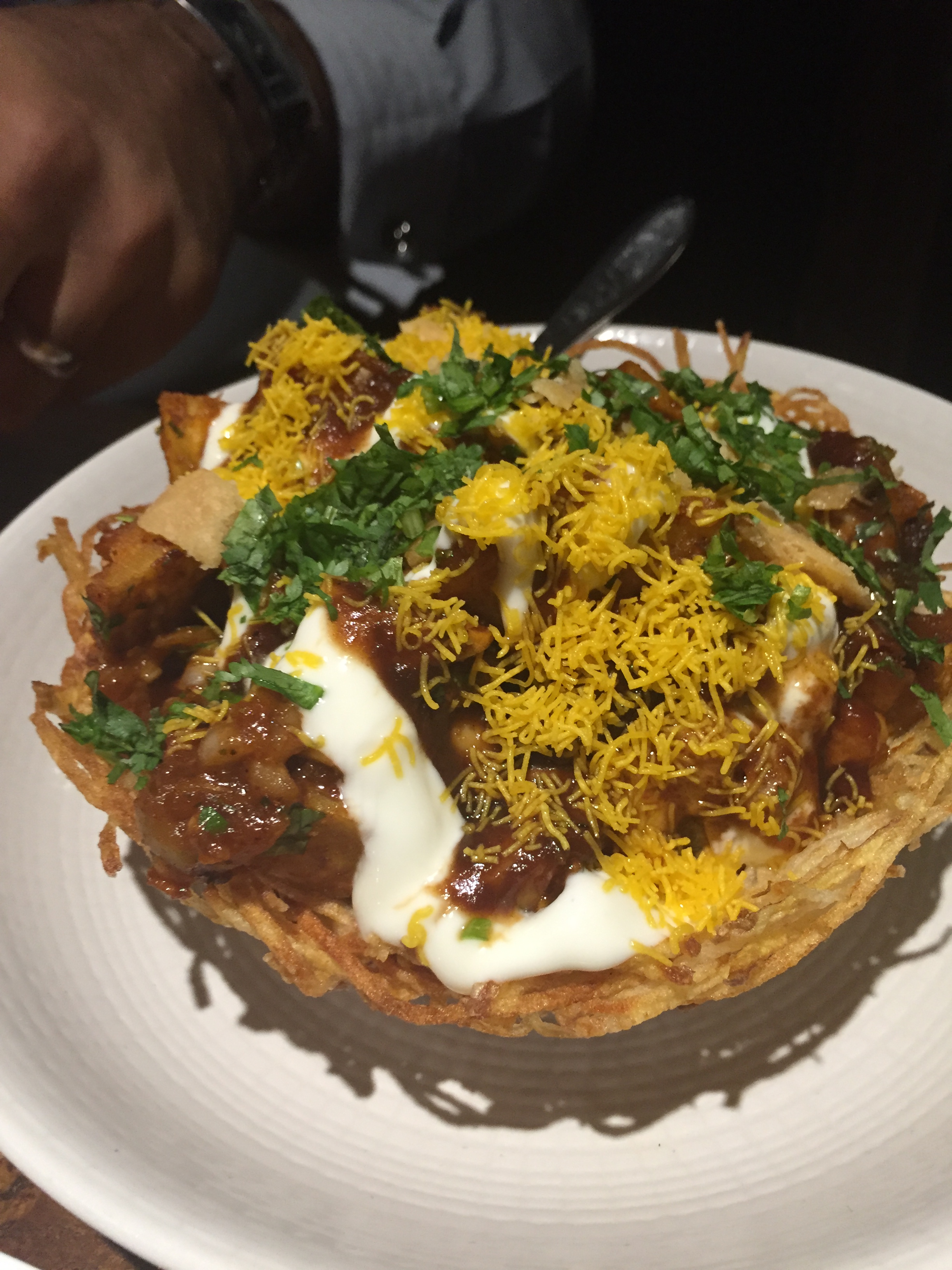For starters the following vegetarian dishes were selected; Aloo Chat with potato, masala chickpea, tamarind, sweet yoghurt presented in an edible basket and Paneer Tikka Anardana with fried onion, mint, corn and a pomegranate chat. Both dishes were delicious, especially the aloo chat with the edible basket.