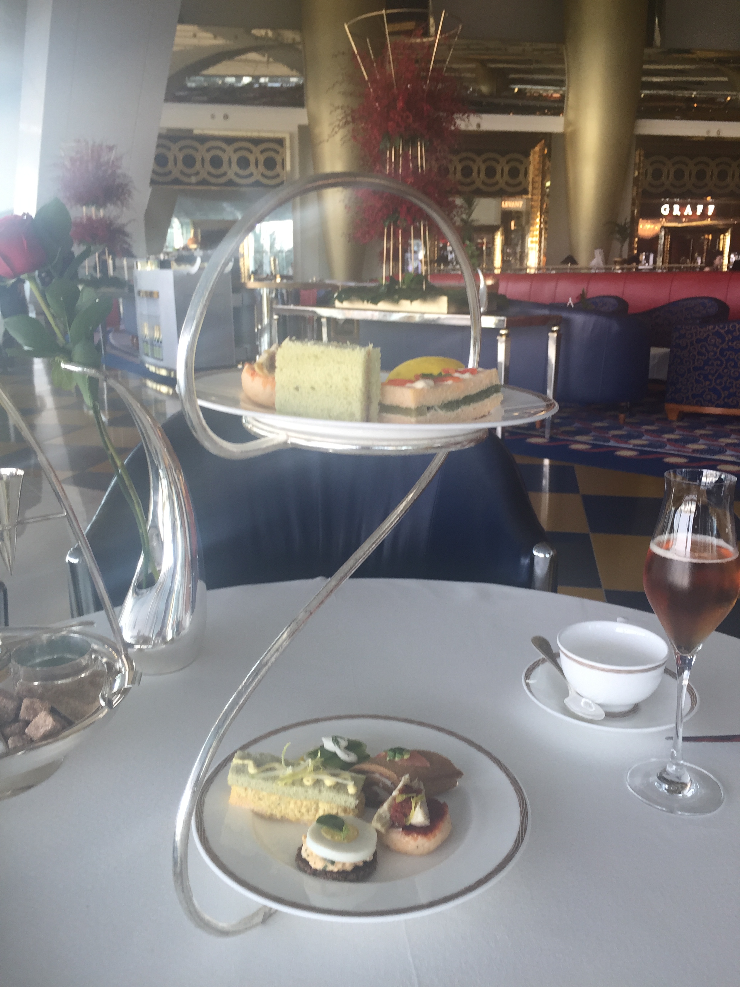 One of the ways to see the 7 star rated hotel in Dubai without spending over £1000 per night, is by booking the Burj Al Arab afternoon tea package either at the skyview bar or at the Sahn Eddar which is what my husband booked.