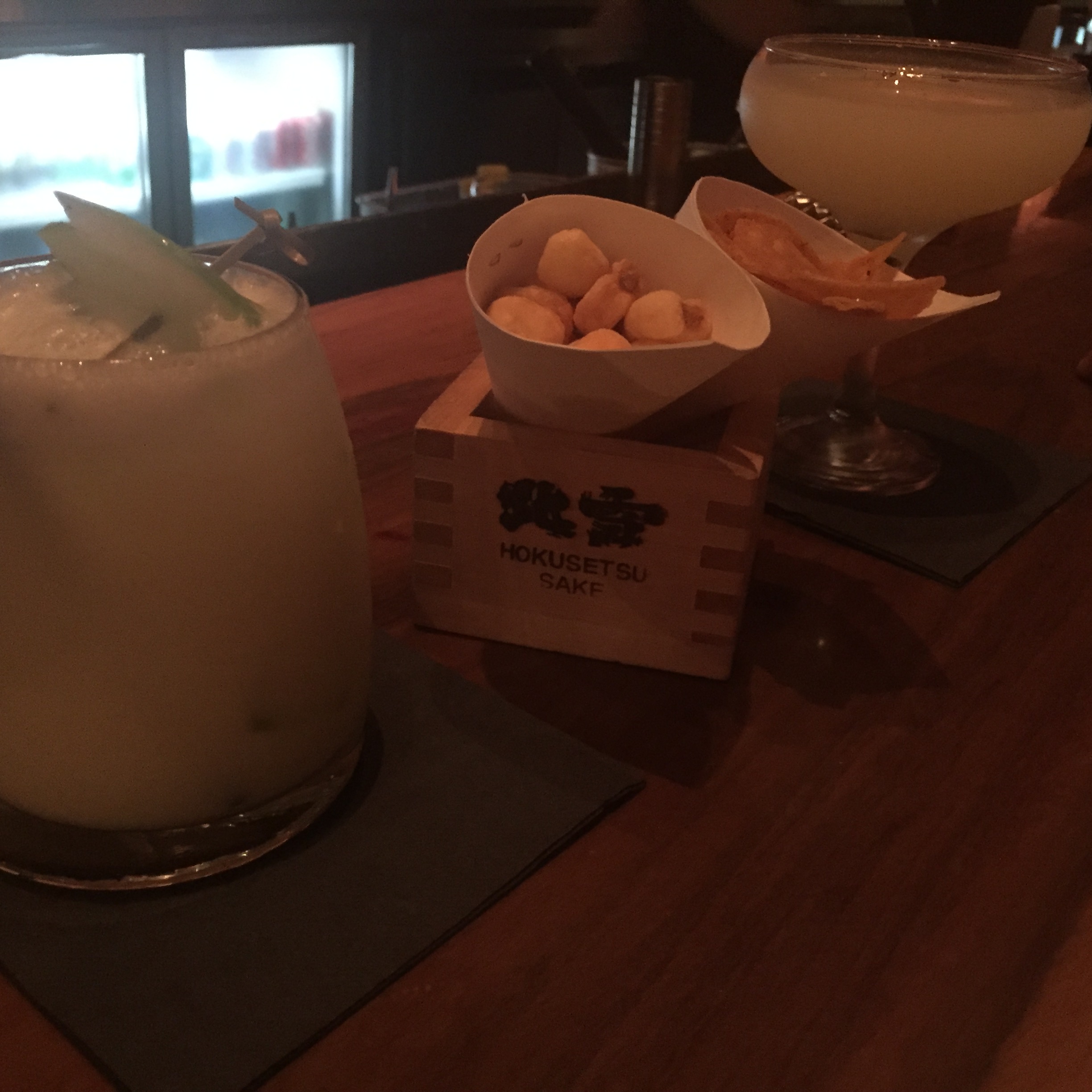As we were slightly early we sat at the sake lounge, which was dimed lit and had a huge bar with a variety of drinks, we ordered our drinks and had those with the nibbles provided.